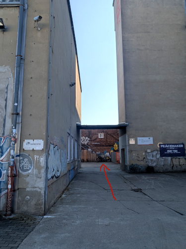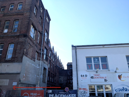 Nun stehen Sie idealerweise vor der Tanzzentrale und einer Metalltreppe, die von außen darüber in die 1. Etage geht. Genau hier sind Sie richtig: